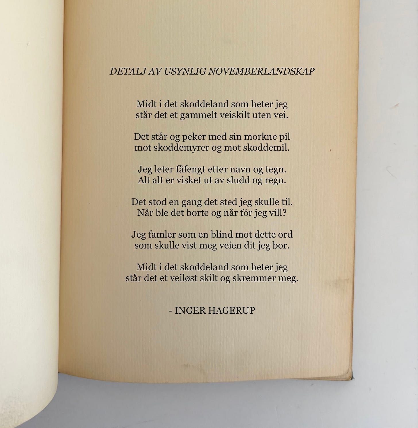 Det er altså ett av veiskiltene jeg har foran meg. Og det peker i en retning som er verdt å gå en omvei for. De andre veiskiltene november har vist er like navnløse som Hagerups. De står der bare tomme og peker med en pil tilbake og en pil frem. Tilbake til en bekymringsløs periode av drøm og begjær. Og frem mot… ja, mot hva da egentlig?